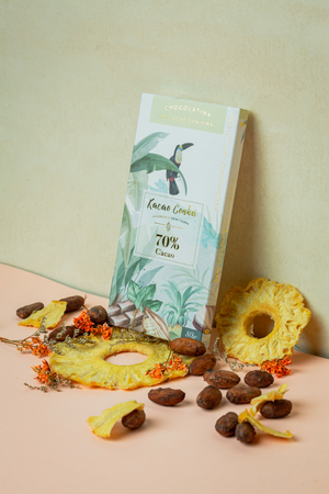Esta barra de chocolate de origen Puerto López Meta, con piña deshidratada, es la unión de dos productos locales. Para los amantes de la fusión de sabores locales, ideales para regalos, maridajes, cenas o simplemente para los amantes del buen cacao.